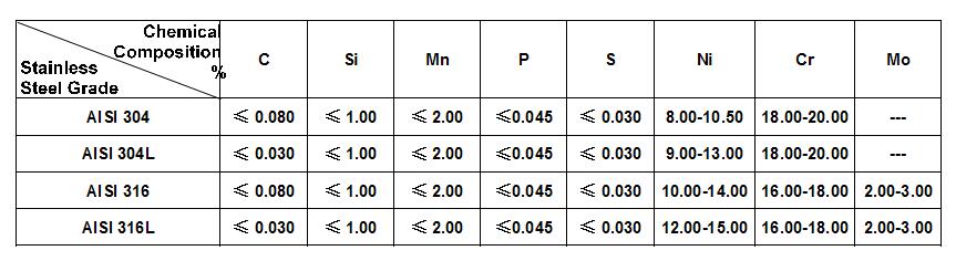 ▼ Composition of AISI 304, 304L, 316 and 316L material stainless steel wire rope mesh