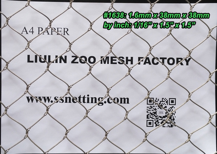 The Stainless steel mesh code 1638: with diameter 1/16″(1.6mm), aperture 1.5inch x 1.5inch (38mm x 38mm) suitable for birds’ cage netting, bird aviary netting, parrots cage netting, which can prevent the small bird out of the cage, and prevent the other animals like weasel go in the cage.